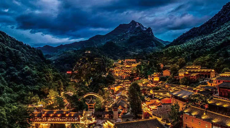 夜幕低垂,华灯初上,浪漫的气息笼罩着整个山谷,隐世悬崖之上的灯火阑珊,山林溪水相伴,享受仙谷夜色。