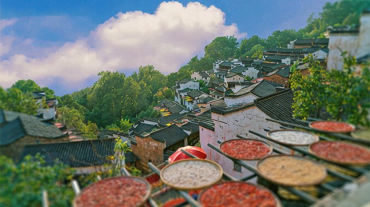 挂在山崖上的篁岭古村,地无三尺平,数百年来,村民早已习惯用平和的心态与崎岖的地形“交流”,绘就出了一处“晒秋人家”风情画。