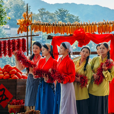 立秋一到,篁岭古村就成了一个天地晒场。来晒秋人家赏红枫,欣赏屋顶晒秋,枫林尽染,体验民风民俗,手摇风车、套南瓜等,感受晒秋人家的乡愁韵味。