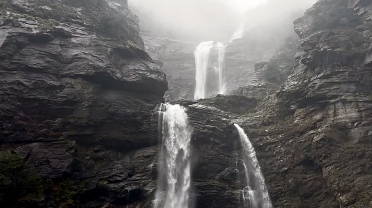 ['瀑布冲击形成暗绿色的深潭']
