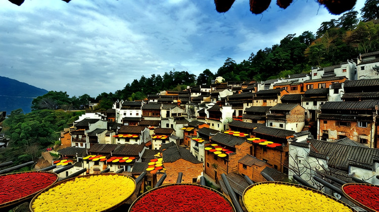 挂在山崖上的篁岭古村,地无三尺平,数百年来,村民早已习惯用平和的心态与崎岖的地形“交流”,绘就出了一处“晒秋人家”风情画。