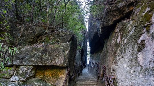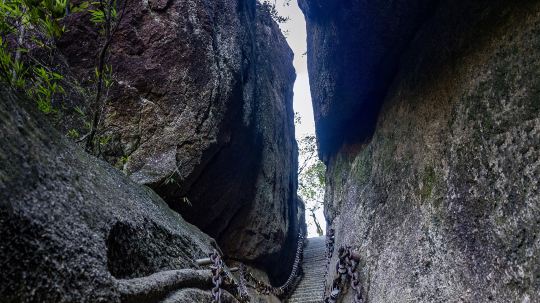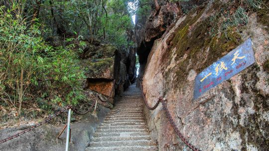 一线天位于在三清山南清园景区内,因两壁夹峙,缝隙所见蓝天如一线而得名。从神龙戏松绝景前往玉女开怀,便是一线天峡谷,高度近100米,斜长120米,峡谷宽0.7到1米。
