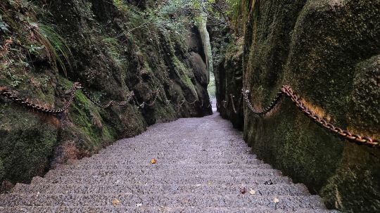 一线天的石阶陡峭,登上它还是要费一些力气的。299级台阶正好预示了一个美好的愿望——“爱久久”,爱情天长地久。在登顶台阶的扶手边,非常吸引人的莫过于栏杆上那密密麻麻镌刻了无数情侣名字的同心锁。有心的情侣,可别错过了这个机会,在铁链上扣上一把同心锁,永结同心吧!