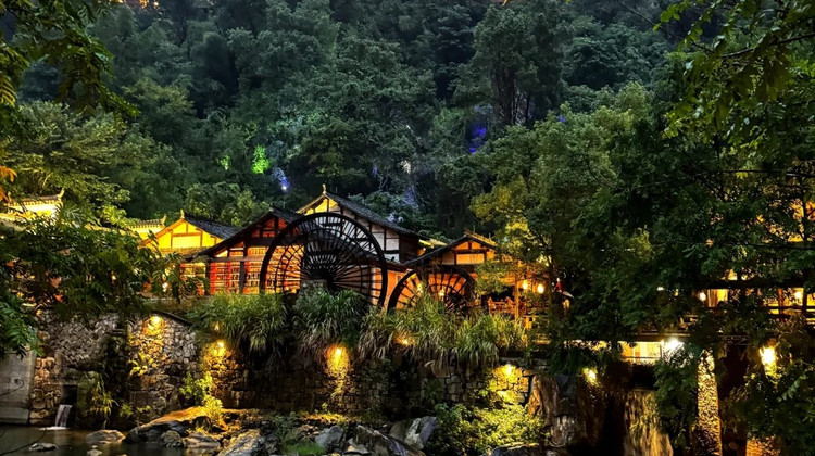 夜幕低垂,华灯初上,浪漫的气息笼罩着整个山谷,隐世悬崖之上的灯火阑珊,山林溪水相伴,享受仙谷夜色。