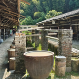景德镇城东南十余里有一片老式农宅和陶瓷作坊,叫三宝国际陶艺村。整个村子看似普通的很旧的农家小院,进入门内是一个陶泥标志物,里面嵌了很多瓷片、陶艺作品,院子里有从外面引入的小溪,水清见底,躺着的瓷碗、瓷片,有的掩埋了一半在泥里,古老的木制农具和当地的日常用品静静地待在一边,原木的门上贴着的大红春联。原木的长凉亭,原木的农家的米桶是椅子。它随意、简单、毫无章法、却野趣天成。