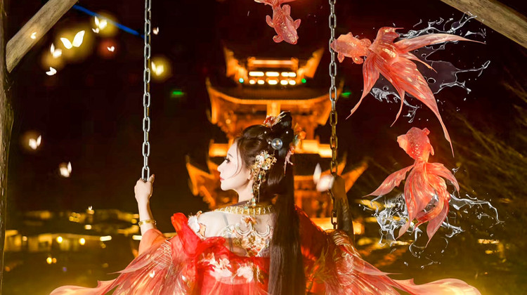位于众妙阁的水舞台,每晚都会上演一场场真人演绎的大型实景水幕电影,水幕与光影交融,带来流光溢彩的视觉盛宴,演员随着时而激荡时而舒缓的音乐起舞,演绎出一幕幕跌宕起伏的盛世传奇故事。