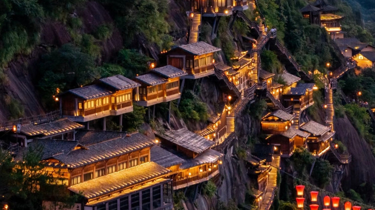 夜幕低垂,华灯初上,浪漫的气息笼罩着整个山谷,隐世悬崖之上的灯火阑珊,山林溪水相伴,享受仙谷夜色。