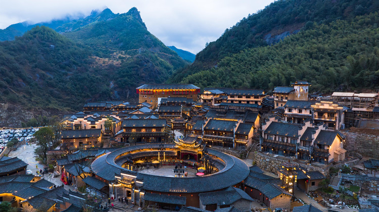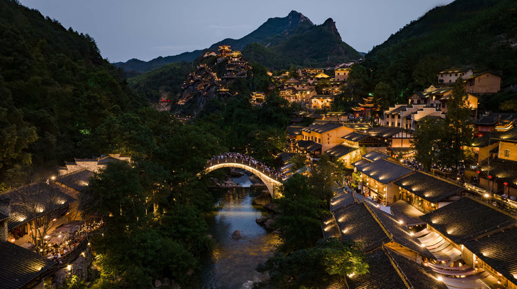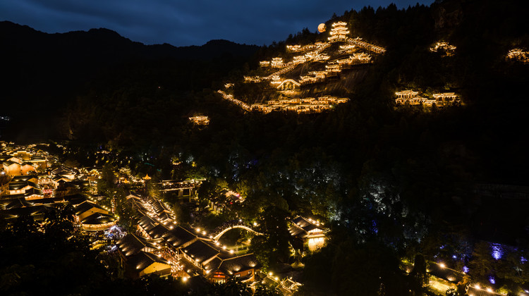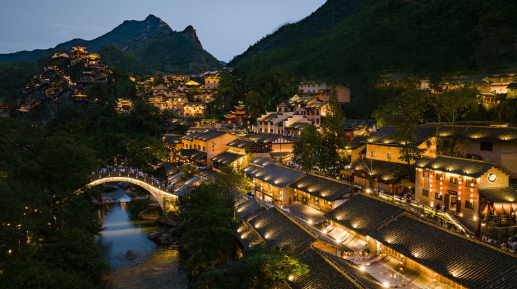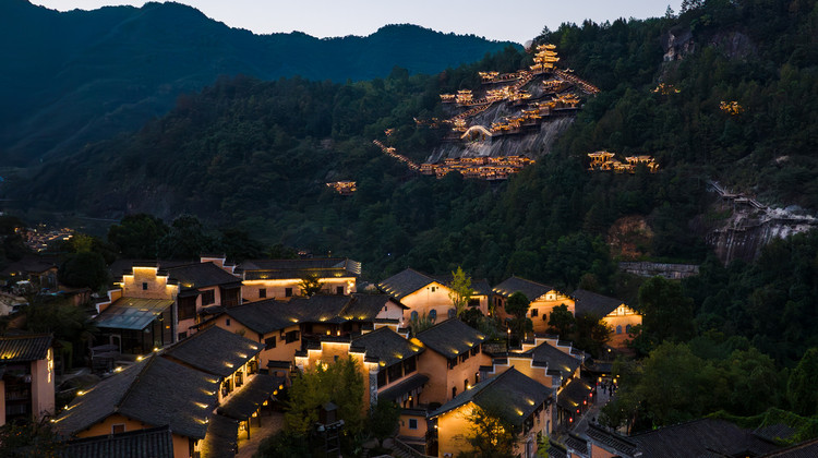夜幕低垂,华灯初上,浪漫的气息笼罩着整个山谷,隐世悬崖之上的灯火阑珊,山林溪水相伴,享受仙谷夜色。