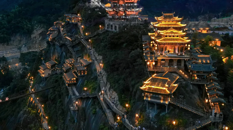 到了晚上,这里将上演隆重庄严的众妙阁秀,现代科技灯光与古建筑的结合如梦似幻,给人带来极具视觉冲击力的体验。