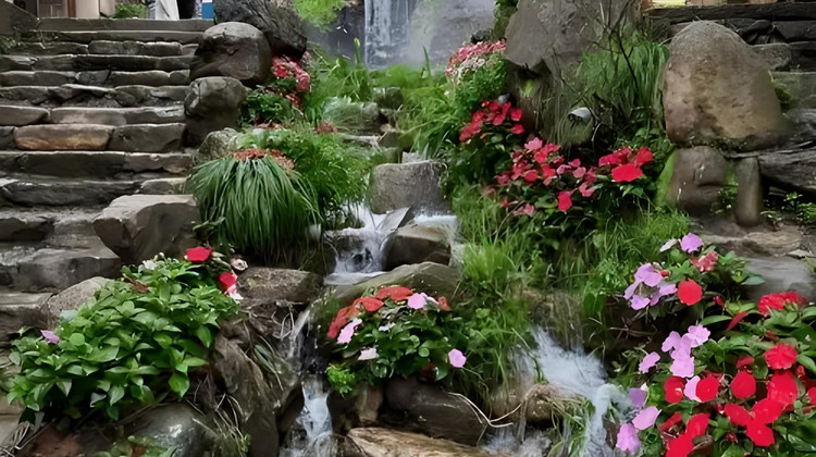['鲜花和水雾包围的坡面街道']