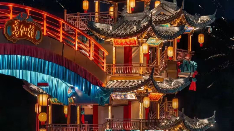 位于众妙阁的水舞台,每晚都会上演一场场真人演绎的大型实景水幕电影,水幕与光影交融,带来流光溢彩的视觉盛宴,演员随着时而激荡时而舒缓的音乐起舞,演绎出一幕幕跌宕起伏的盛世传奇故事。