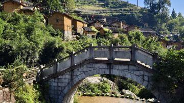 从七星墩左边的游步道下山,一路下来有瀑布相伴。差不多一小时可至山下的坑根石寨,寨子已经有些年头了,有一些黄色的石头砌的老房子,零星几家杂货店,并没有太多商业意味。一进村有一口老泉井,是当年开采银矿留下的,村口小河上一座银官桥,也是当年采矿修建的。