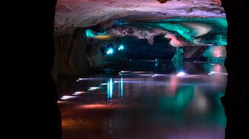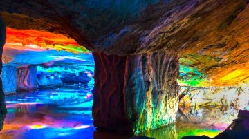 小蓬莱,赤壁下的昆潭中多奇石,远近错落,散而不乱。在深潭中组成或深或浅、或宽或狭、或大或小、或分或连的空洞和水面。如果泛舟而入,这溪中有岛,岛中有湖,景随舟移,晃如置于蓬莱仙境之中,故有“小蓬莱”之称。